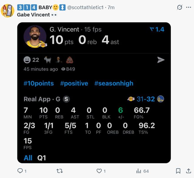 北京時間10月6日,NBA季前賽,湖人VS勇士,文森特復(fù)出的上半場打出了完美表現(xiàn),短短11分鐘就拿到16分,但他下場后湖人崩盤了,第三節(jié)開場湖人全隊都松松垮垮沒有戰(zhàn)意,文森特第三節(jié)也很快被換下,他首秀16+5+3三分真的很不錯了。