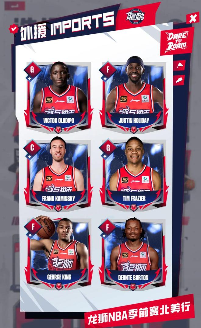在本次NBA季前賽開始前,廣州龍獅俱樂部一口氣簽下奧拉迪波、賈斯汀·霍勒迪、卡明斯基、蒂姆·弗雷澤、喬治·金和德恩特·伯頓等六位臨時外援,在為期半個月的北美行期間,他們參與到廣州龍獅的日常行程和訓練當中,并隨隊征戰即將到來的三場NBA季前賽。他們在爭取留在NBA,同時廣州隊或者其他CBA球隊也可以通過NBA季前賽考察這些球員。