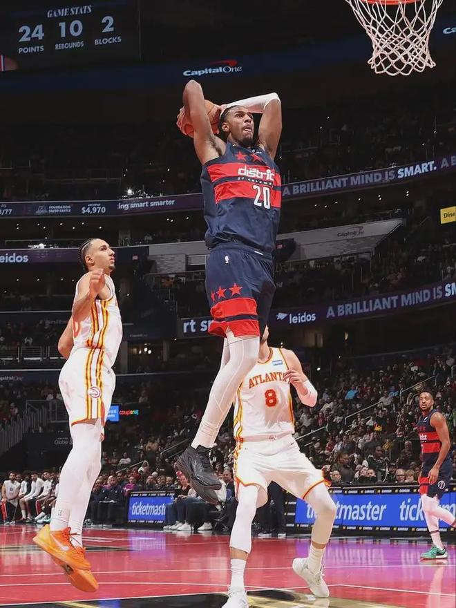 2024屆榜眼薩爾本賽季為奇才首發(fā)出戰(zhàn)17場比賽,場均出戰(zhàn)29.4分鐘,得到19分8.3籃板3.2助攻0.8搶斷1.9蓋帽2失誤,三項命中率:51%,35.7%,63.9%。場均得分比新秀賽季多了6分,場均籃板多了1.8,助攻多了0.8。